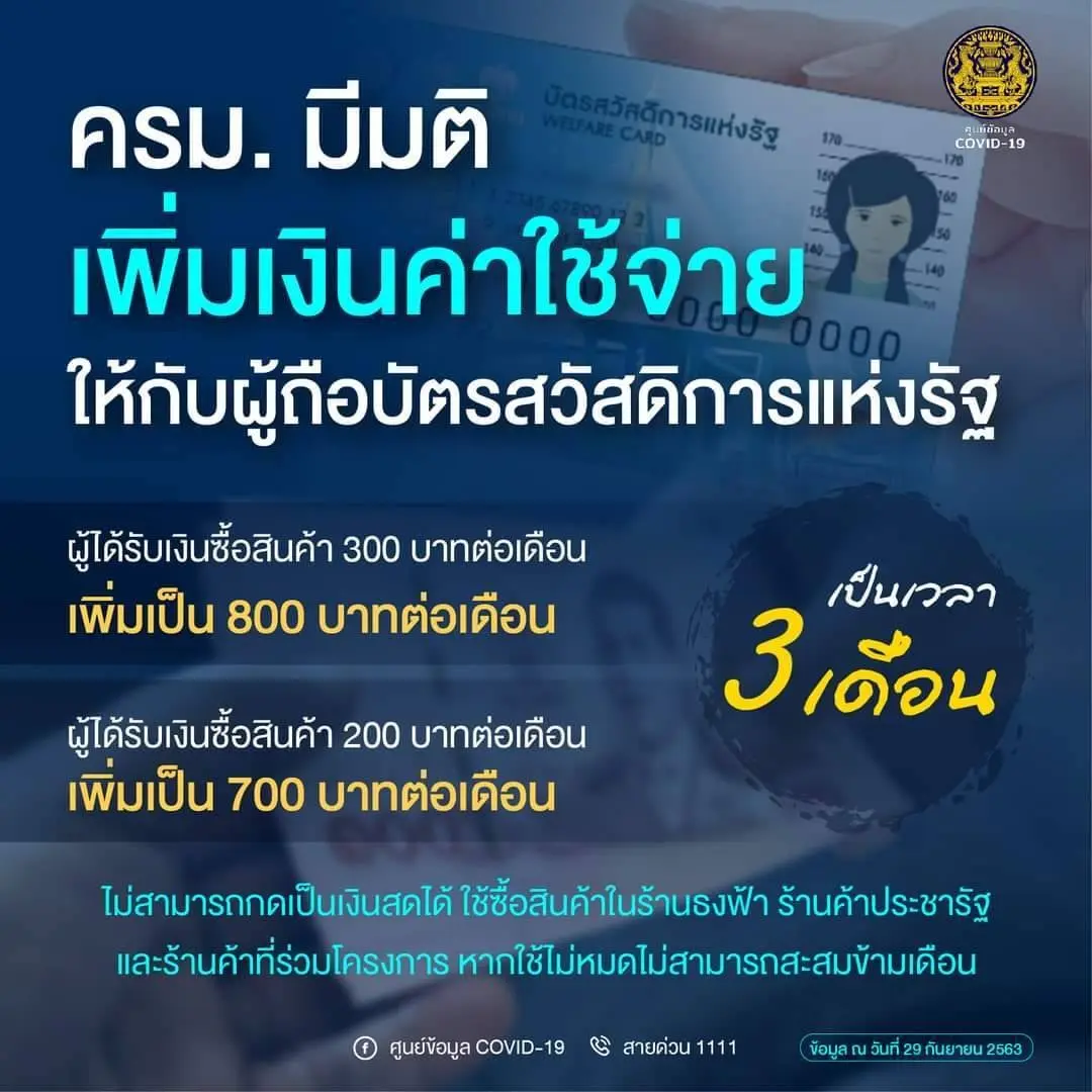 คณะรัฐมนตรี หรือ ครม. มีมติเพิ่มเงินค่าใช้จ่ายให้กับผู้ถือ บัตรสวัสดิการแห่งรัฐ จำนวน 500 บาทต่อคนต่อเดือน เป็นระยะเวลา 3 เดือน ดังนี้