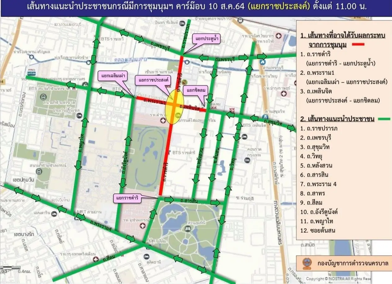 ล่าสุด กองบัญชาการตำรวจนครบาลเผยแพร่แนะนำหลีกเลี่ยงเส้นทางจราจร โดย พล.ต.ต.จิรสันต์ แก้วแสงเอก รอง ผบช.น. และ พล.ต.ต.ธีระพงษ์ วงษ์รัฐพิทักษ์ ผบก.จร. ขอประชาสัมพันธ์ข่าวสารให้ประชาชนผู้ใช้รถใช้ถนนได้รับทราบ เนื่องจากบริเวณแยกราชประสงค์ เป็นพื้นที่ที่มีการจราจรหนาแน่น เป็นเส้นทางสายหลักซึ่งประชาชนใช้ในการสัญจร เป็นแหล่งศูนย์กลางการค้าที่สำคัญ การจราจรหนาแน่นทั้งในช่วงเวลาปกติและช่วงเวลาเร่งด่วน เพื่อความสะดวกในการเดินทางของพี่น้องประชาชน จึงขอแจ้งข้อมูลข่าวสารด้านการจราจร โดยขอให้หลีกเลี่ยงเส้นทางตั้งแต่เวลา 11.00 น. เป็นต้นไป จนเสร็จสิ้นการชุมนุม ดังนี้