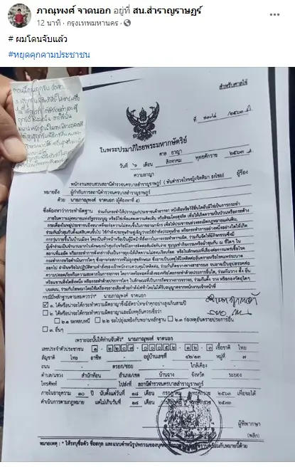 ทั้งนี้หลังจากโดนจับกุมตัว ได้โพสต์ภาพพร้อมเอกสารตำรวจ ระบุคำว่า ผมโดนจับแล้ว และคำว่า หยุดคุกคามประชาชน
