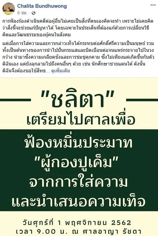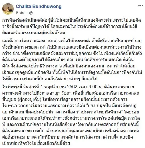ในวันพรุ่งนี้ วันศุกร์ที่ 1 พฤศจิกายน 2562 เวลา 9.00 น. ดิฉันพร้อมทนายความจะเดินทางไปถึงศาลอาญา รัชดา เพื่อยื่นฟ้องร้อยเอกหรือนายทรงกลด ชื่นชูผล (ผู้กองปูเค็ม) ในข้อหาหรือฐานความผิดหมิ่นประมาทด้วยการโฆษณา จากการใส่ความและกล่าวเท็จว่าดิฉัน “ยุยง ปลุกปั่น มีแนวคิดกบฏ แยกดินแดน มีผลประโยชน์ทางการเมือง ทำประเทศไทยพังพินาศ” โดยร้อยเอกหรือนายทรงกลดได้กระทำการดังกล่าวผ่านทางการโพสต์เฟซบุ๊ค การไลฟ์ และการเขียนข้อความในหนังสือถึงมหาวิทยาลัยเกษตรศาสตร์ พร้อมกันนี้ ดิฉันและทนายความก็กำลังรวบรวมข้อมูลและจะดำเนินการฟ้องร้องทางแพ่งต่อสื่อมวลชนบางสำนักที่มีบทบาทหลักในการใส่ความ กล่าวเท็จ และบิดเบือนข้อเท็จจริงในเรื่องเดียวกันนี้ด้วย”