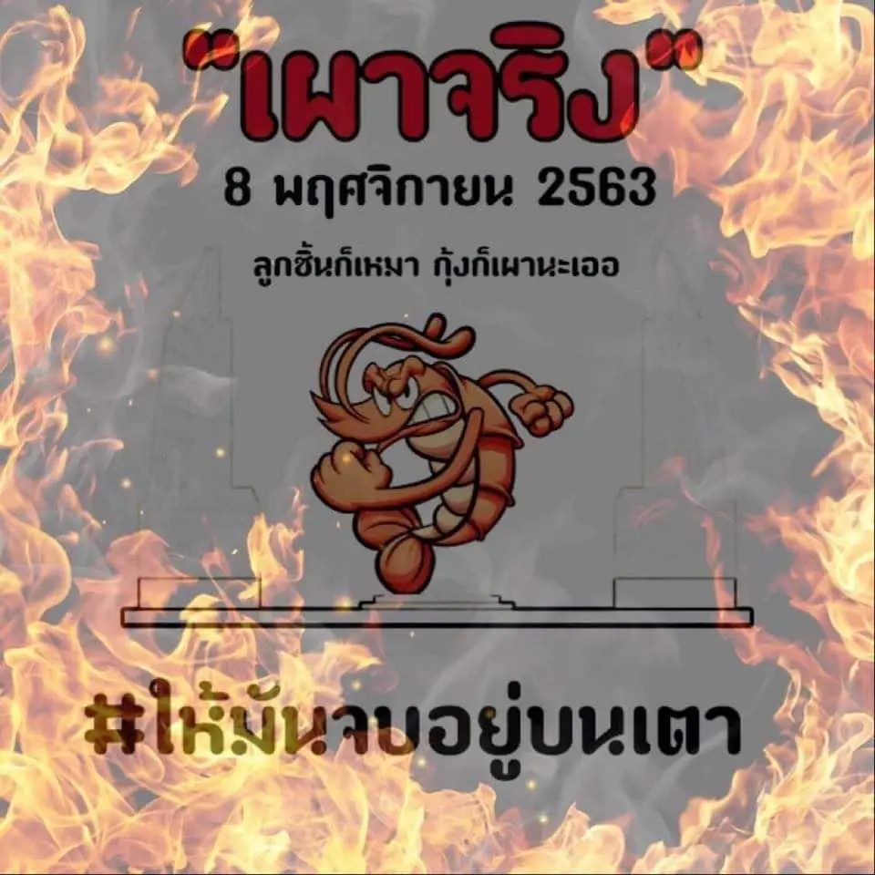 ล่าสุด เจ้าตัวผู้ที่สนับสนุนการชุมนุมของผู้เรียกร้องประชาธิปไตย โพสต์ข้อความผ่านเฟซบุ๊ก ระบุว่า #ให้มันจบที่กุ้งเรา แยกคอกวัว เวลาประมาณบ่ายสอง กุ้งร้อยโล ปลาหมึก50โล พร้อมจานและถ้วยน้ำจิ้มรอคุณอยู่ค่ะ ใครแพ้อาหารทะเล หมูหัน5ตัว มีสแตนบายนะคะ