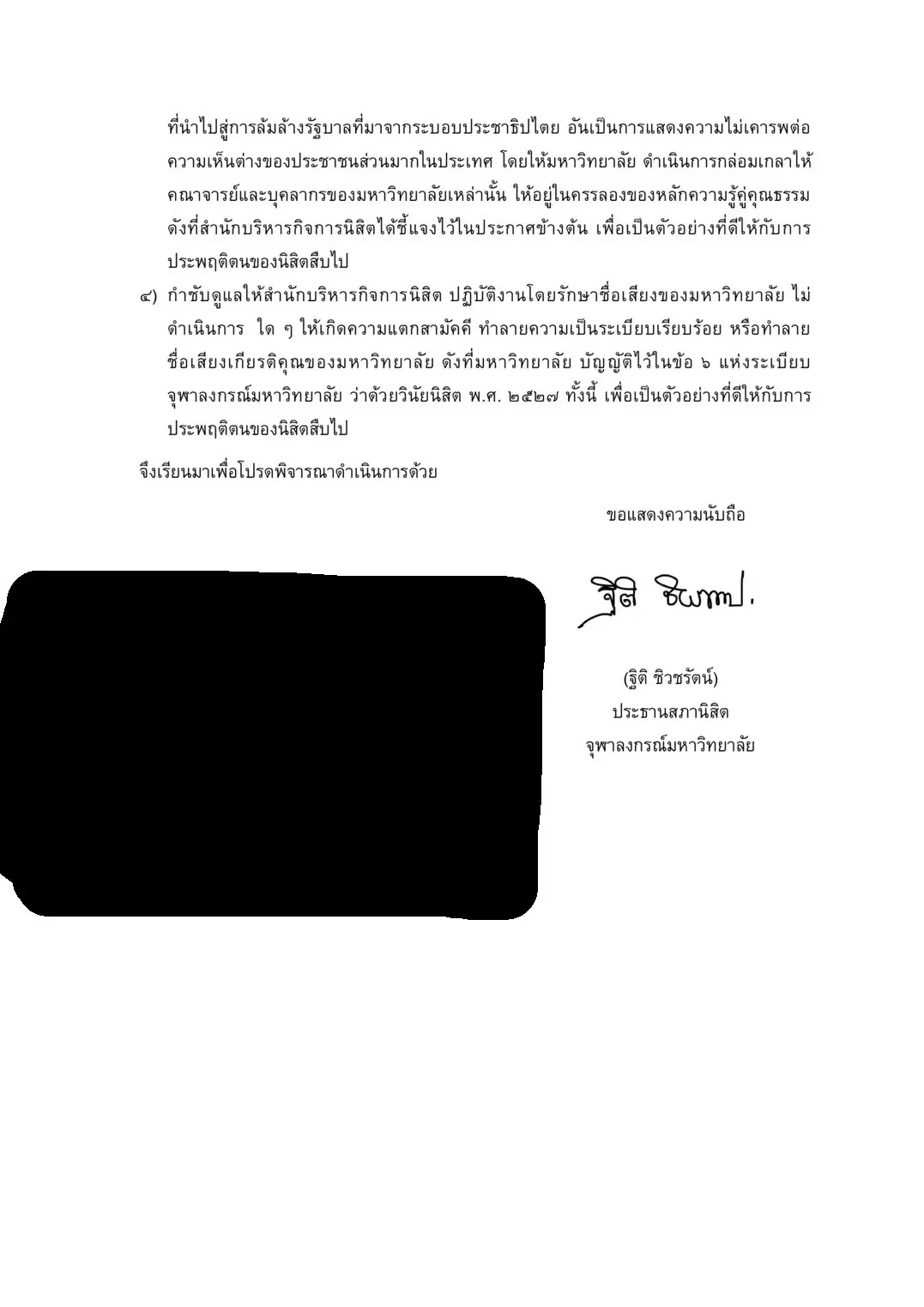 ๒) เคารพความเห็น ความเชื่อเลื่อมใส และสนับสนุนเสรีภาพในการแสดงออกของนิสิตอย่างแท้จริง ดังที่สำนักบริหารกิจการนิสิต ได้แสดงเจตจำนงไว้ในประกาศข้างต้น ซึ่งรวมไปถึงยุติการคุกคาม ข่มขู่ ขัดขวาง และ/หรือ บังคับ ให้นิสิตกระทำการ หรืองดเว้นการกระทำการใด ๆ ที่ไม่ขัดต่อจริยธรรมสากล ไม่ว่าจะเป็นการดำเนินการทางวินัยนิสิต การอนุญาตให้ใช้สถานที่ของมหาวิทยาลัย หรือการอนุมัติเงินทุนสนับสนุนของมหาวิทยาลัย
