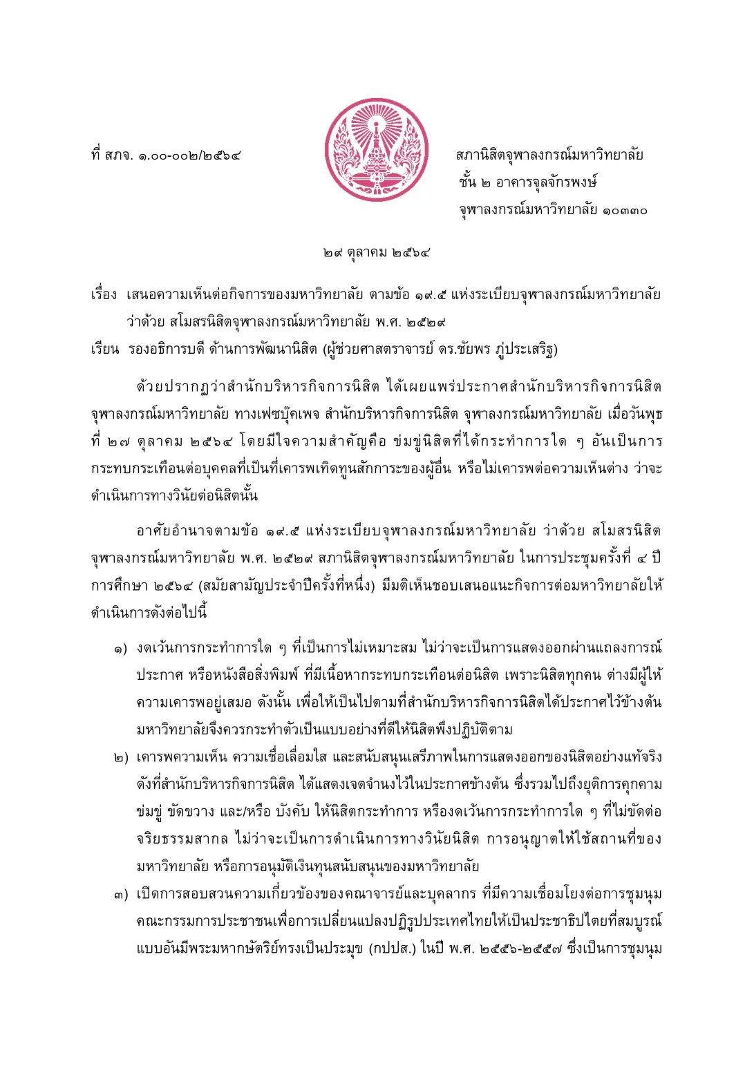 ด้วยปรากฏว่าสำนักบริหารกิจการนิสิต ได้เผยแพร่ประกาศสำนักบริหารกิจการนิสิต จุฬาลงกรณ์มหาวิทยาลัย ทางเฟซบุ๊คเพจ สำนักบริหารกิจการนิสิต จุฬาลงกรณ์มหาวิทยาลัย เมื่อวันพุธที่ ๒๗ ตุลาคม ๒๕๖๔ โดยมีใจความสำคัญคือ ข่มขู่นิสิตที่ได้กระทำการใด ๆ อันเป็นการกระทบกระเทือนต่อบุคคลที่เป็นที่เคารพเทิดทูนสักการะของผู้อื่น หรือไม่เคารพต่อความเห็นต่าง ว่าจะดำเนินการทางวินัยต่อนิสิตนั้น อาศัยอำนาจตามข้อ ๑๙.๕ แห่งระเบียบจุฬาลงกรณ์มหาวิทยาลัย ว่าด้วย สโมสรนิสิตจุฬาลงกรณ์มหาวิทยาลัย พ.ศ. ๒๕๒๙ สภานิสิตจุฬาลงกรณ์มหาวิทยาลัย ในการประชุมครั้งที่ ๔ ปีการศึกษา ๒๕๖๔ (สมัยสามัญประจำปีครั้งที่หนึ่ง) มีมติเห็นชอบเสนอแนะกิจการต่อมหาวิทยาลัยให้ดำเนินการดังต่อไปนี้