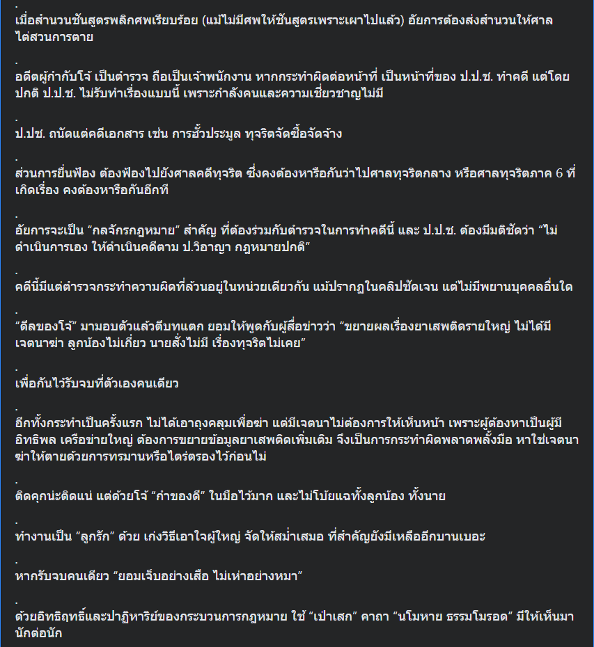 ว่ากันว่า “เสือย่อมไม่กินเนื้อเสือฉันใด ตำรวจย่อมไม่ฆ่าตำรวจที่ตามจับคนร้ายขายยา แล้วพลั้งมือท่ายาก ทำการปั๊มหัวใจไม่เป็น ทั้งมีเจตนาเอาข้อมูลขยายผล สกัดตัดวงจรเครือข่ายยาเสพติดรายใหญ่เพื่อปกป้องสังคมเยาวชน ฉันนั้น”