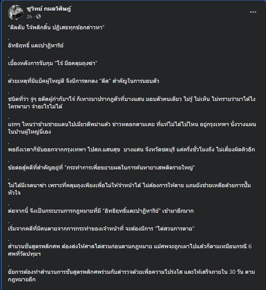 ผู้กำกับโจ้ — นายชูวิทย์ กมลวิศิษฎ์ อดีต ส.ส.และหัวหน้าพรรครักประเทศไทย ได้โพสต์เฟซบุ๊กในวันนี้ (28 ส.ค. 2564) ในหัวข้อ “ดีลลับ โจ้พลิกลิ้น ปฏิเสธทุกข้อกล่าวหา” เพื่อเปิดโปงข้อมูลเบื้องหลังการเข้ามอบตัวของพ.ต.อ. ธิติสรรค์ อุทธนผล หรือ อดีตผู้กำกับโจ้ ที่ก่อเหตุทรมานผู้ต้องหาในคดีค้ายาเสพติด จนเสียชีวิต โดยระบุว่า