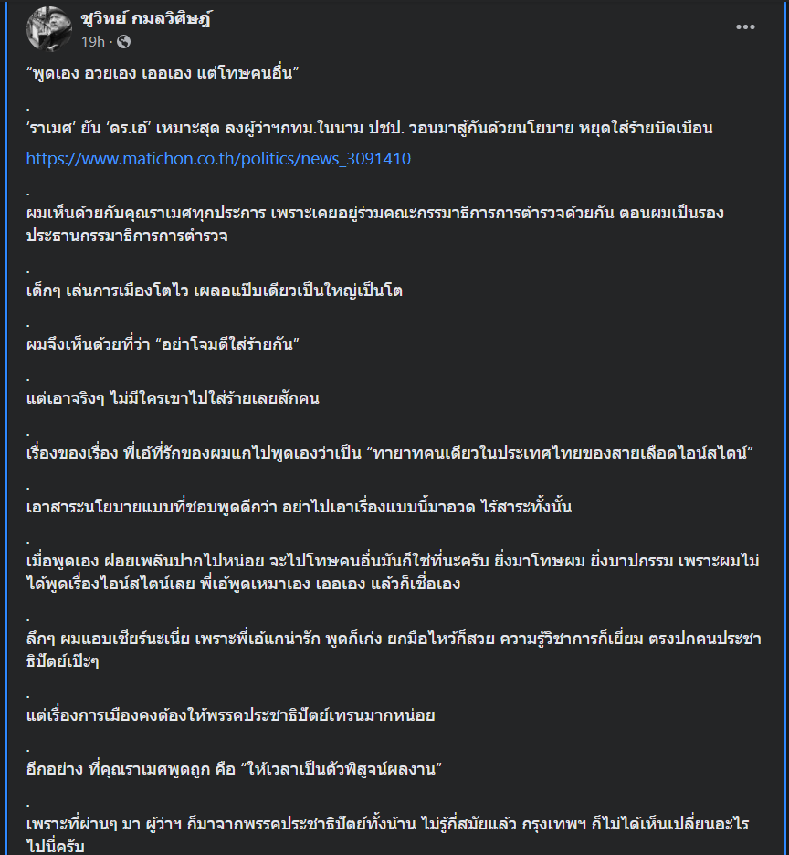 เด็กๆ เล่นการเมืองโตไว เผลอแป๊บเดียวเป็นใหญ่เป็นโต ผมจึงเห็นด้วยที่ว่า “อย่าโจมตีใส่ร้ายกัน” แต่เอาจริงๆ ไม่มีใครเขาไปใส่ร้ายเลยสักคน