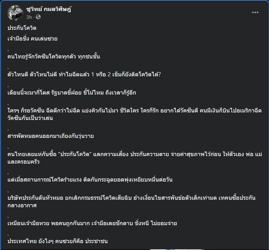 นาย ชูวิทย์ กมลวิศิษฎ์ อดีตหัวหน้าพรรครักประเทศไทยได้โพสต์ข้อความผ่านทางเฟสบุ๊ก ในหัวข้อประกันโควิด เจ้ามือชิ่ง คนเล่นซวย ถึงกรณีที่บริษัท สินมั่นคงประกันภัย จำกัด (มหาชน) ได้ออกหนังสือชี้แจงยกเลิกประกันภัยโควิดเจอ จ่าย จบ หรือ COVID 2 in1 พร้อมจะคืนเงินลูกค้าภายใน 15 วัน นับแต่วันที่กรมธรรม์ประกันภัยสิ้นผลบังคับ โดยนายชูวิทย์ได้แสดงความคิดเห็นในเรื่องดังกล่าว โดยระบุว่า