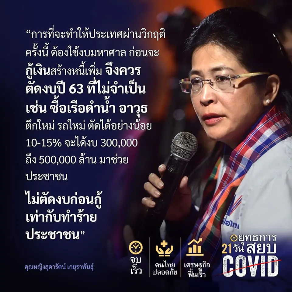 ดิฉันได้เสนอไปหลายวัน และย้ำไปหลายครั้งแล้ว ให้นายกฯ ตัดงบประมาณปี 63 ที่ไม่จำเป็นของทุกกระทรวงลงโดยเฉลี่ย 10% เป็นอย่างน้อย เพื่อเกลี่ยเงินส่วนนี้มาช่วยแก้ไขวิกฤตที่เกิดขึ้น