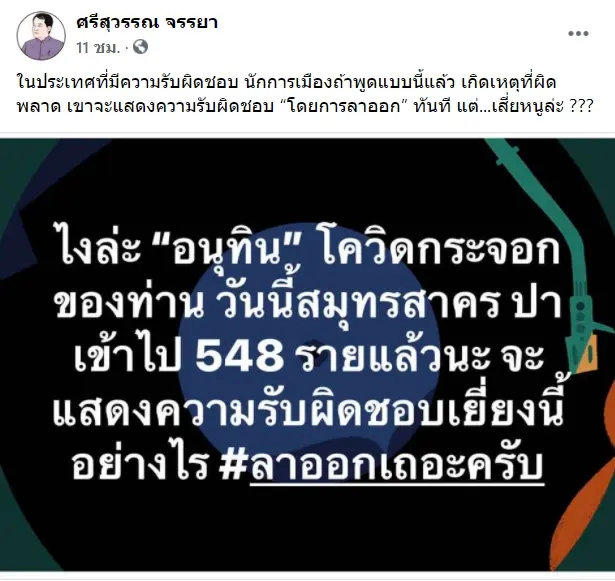 “ไงล่ะ อนุทิน โควิดกระจอกของท่าน วันนี้สมุทรสาครปาเข้าไป 548 รายแล้วนะจ๊ะ แสดงความรับผิดชอบเยี่ยงอย่างไร #ลาออกเถอะครับ”