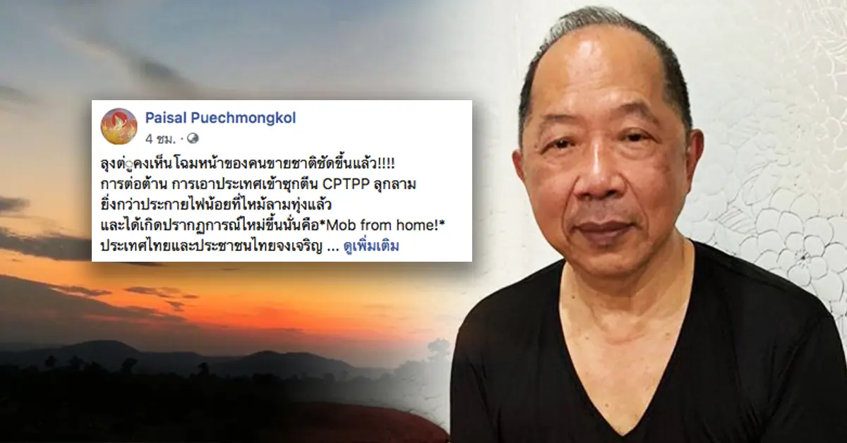 “ลุงตู่คงเห็นโฉมหน้าของคนขายชาติชัดขึ้นแล้ว!!!! การต่อต้าน การเอาประเทศเข้าซุกตีน CPTPP ลุกลามยิ่งกว่าประกายไฟน้อยที่ไหม้ลามทุ่งแล้ว และได้เกิดปรากฏการณ์ใหม่ขึ้น นั่นคือ Mob from home ประเทศไทยและประชาชนไทยจงเจริญ คนขายชาติจงพินาศ!!!”