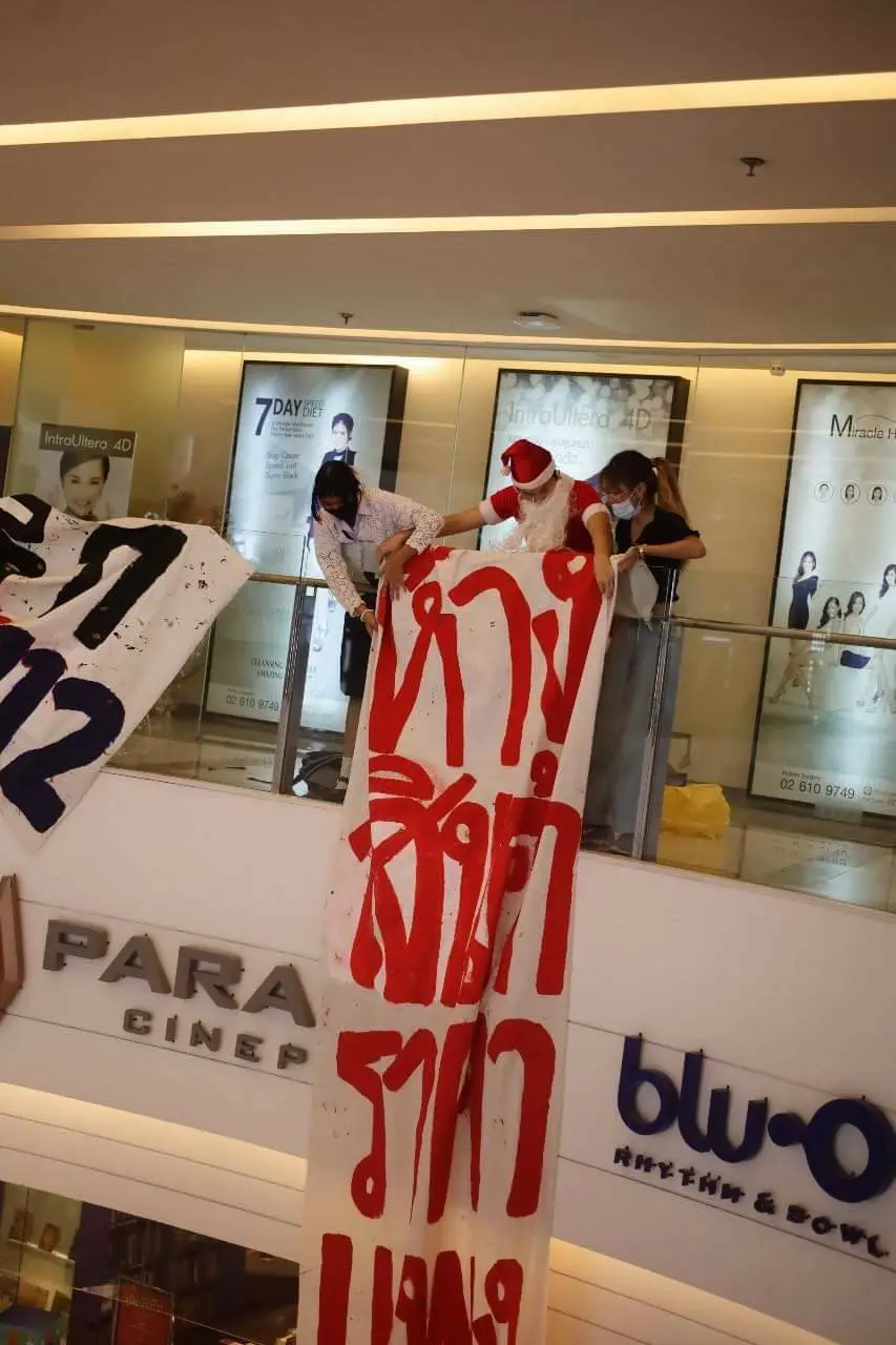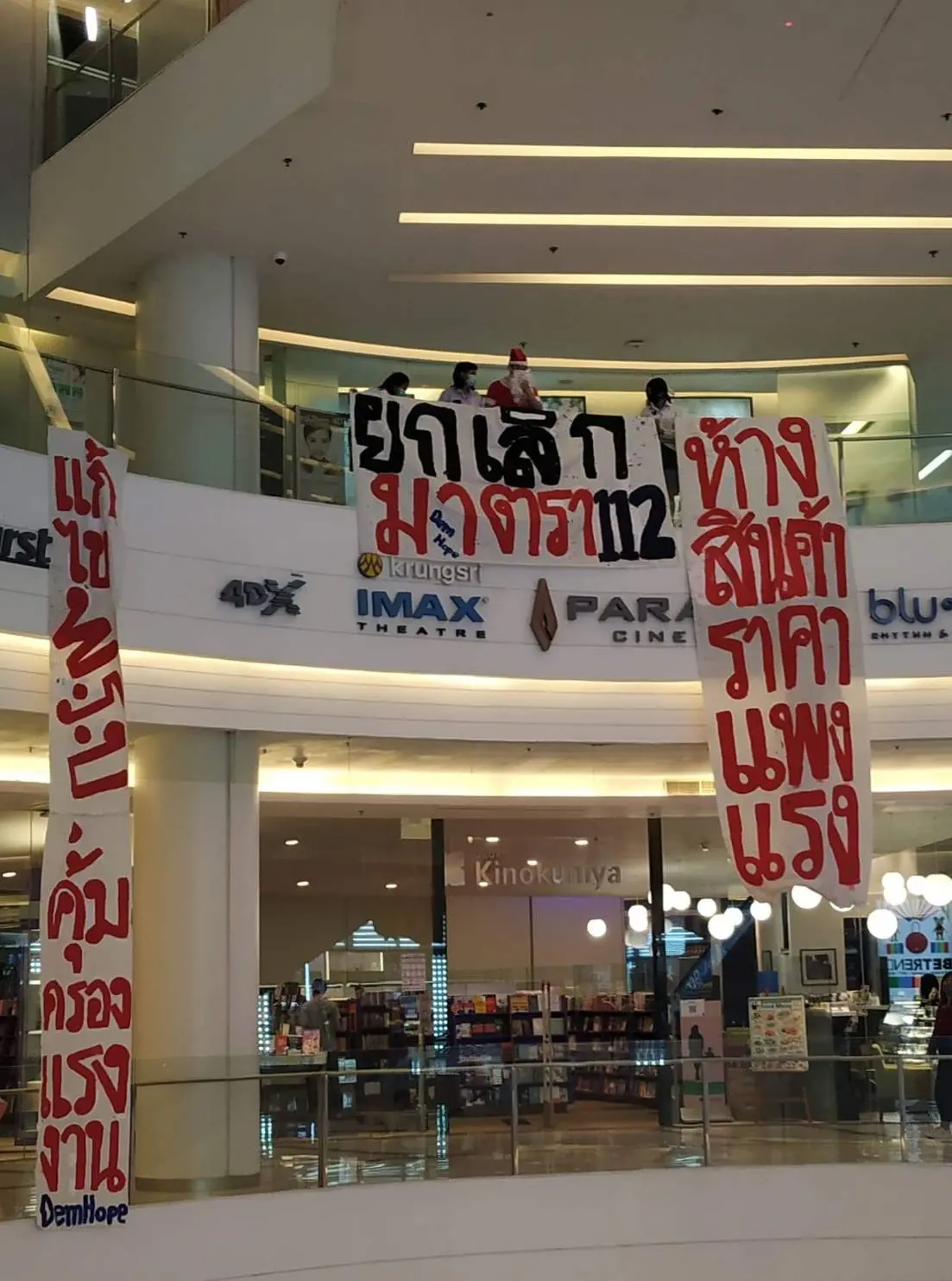 กลุ่มที่เรียกตัวเองว่า คณะประชาธิปไตยเพื่อความหวัง หรือ DemHope นำป้ายผ้าแขวนกลางห้างสยามพารากอน เมื่อช่วงเย็นวานนี้(17ธ..ค.63 ) เพื่อเป็นการประกาศจุดยืน และข้อเรียกร้อง