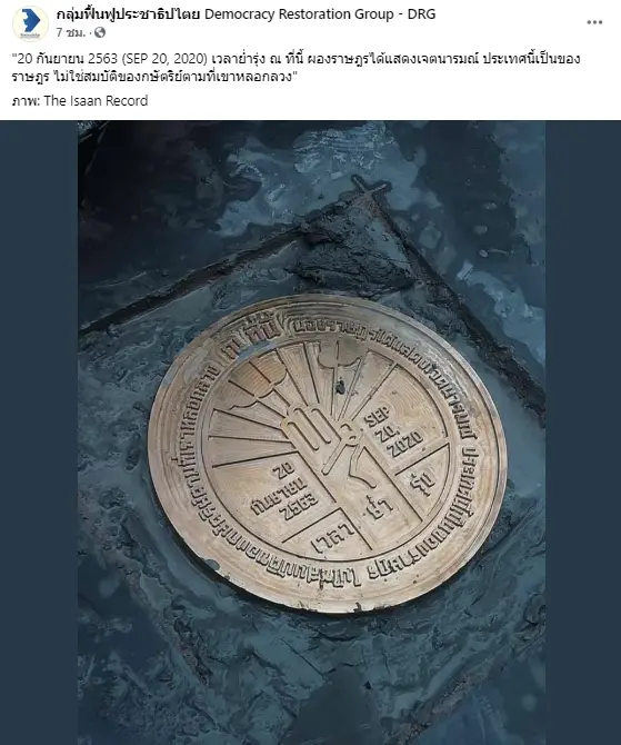 หมุดคณะราษฎร กลุ่มฟื้นฟูประชาธิปไตย Democracy Restoration Group – DRG โพสต์ภาพพร้อมข้อความระบุว่า