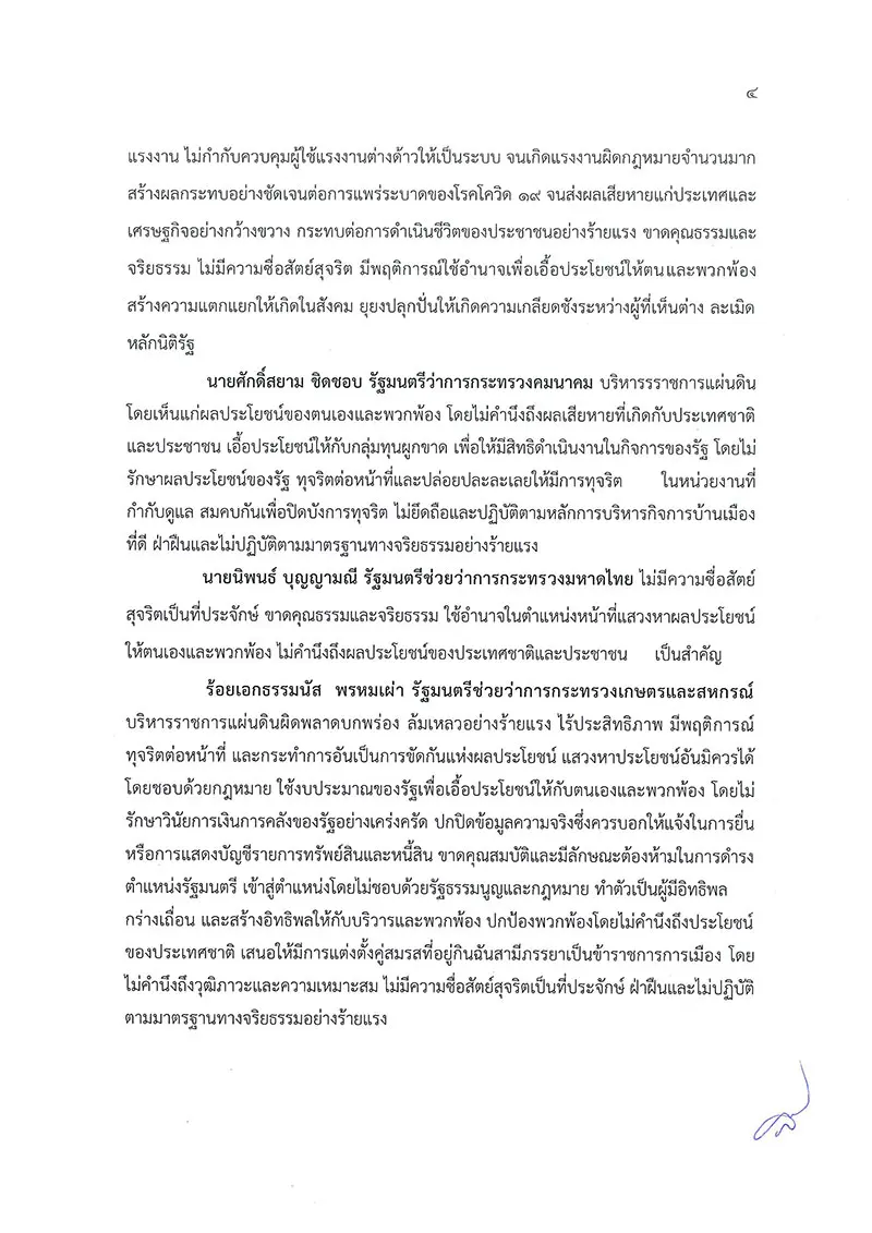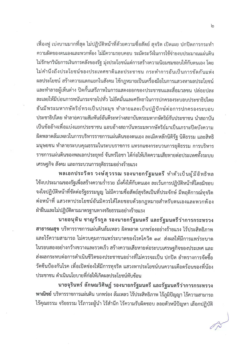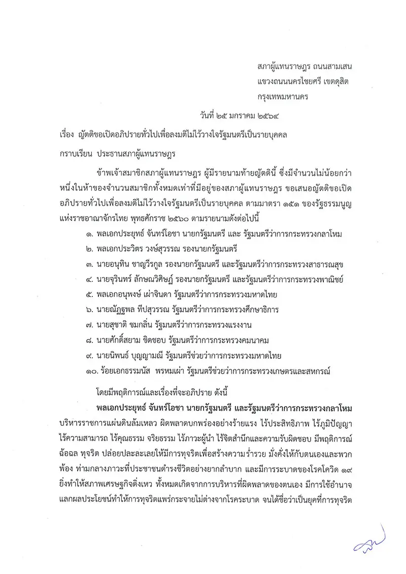 เมื่อวันที่ 25 ม.ค.64 นายสมพงษ์ อมรวิวัฒน์ ผู้นำฝ่ายค้านฯ พรรคเพื่อไทย ยื่นญัตติขอ เปิดอภิปรายไม่ไว้วางใจ รัฐมนตรีเป็นรายบุคคลต่อนายชวน หลีกภัย ประธานสภาผู้แทนราษฎร โดยนายสมพงษ์ กล่าวว่า นอกจาก 6 พรรคฝ่ายค้านแล้ว การยื่นญัตติคราวนี้ยังมีรายชื่อ ส.ส.อีก 2 พรรค คือ พรรคเศรษฐกิจใหม่ กับพรรคไทยศรีวิไลย์ ร่วมด้วย