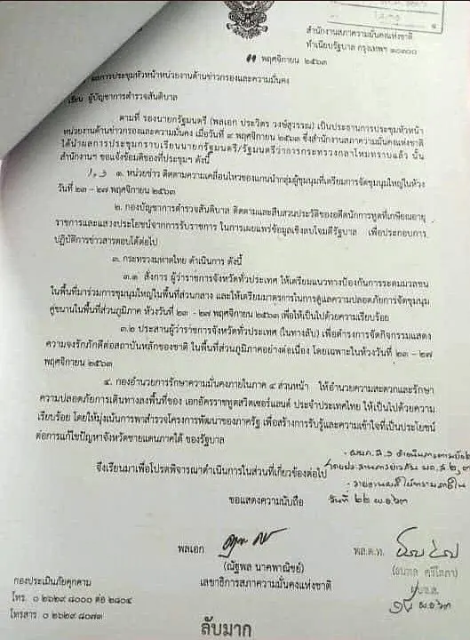 เนื้อหา เอกสารลับ ข้อ 3.2 ประสานผู้ว่าราชการจังหวัดทั่วประเทศ (ในทางลับ) เพื่อดำรงการจัดกิจกรรมแสดงความจงรักภักดีต่อสถาบันหลักของชาติในพื้นที่ส่วนภูมิภาคอย่างต่อเนื่องโดยเฉพาะในช่วงวันที่ 23 ถึง 27 พฤศจิกายน