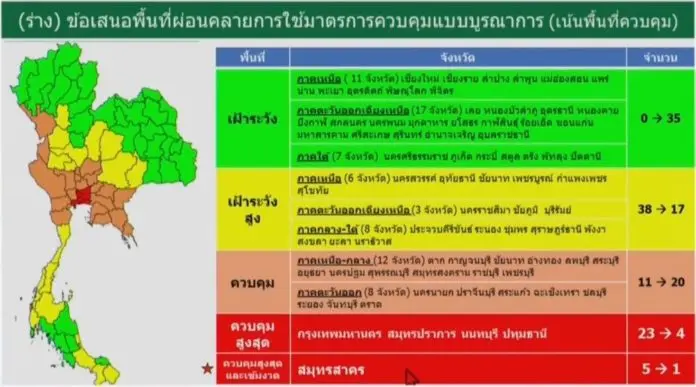 2.พื้นที่ควบคุมสูงสุดหรือสีแดง จาก 23 จังหวัด ให้ลดเหลือ 4 จังหวัด คือ กรุงเทพมหานคร สมุทรปราการ นนทบุรีและ ปทุมธานี