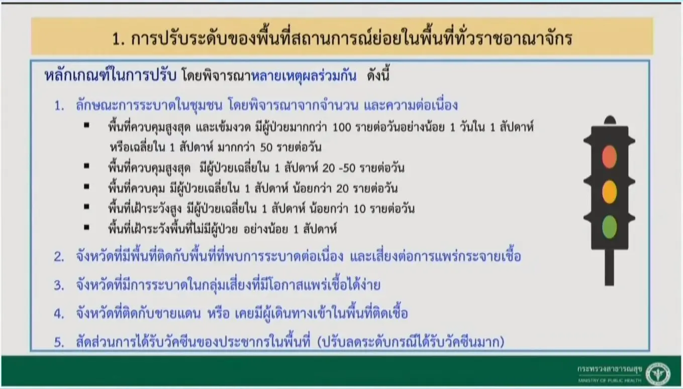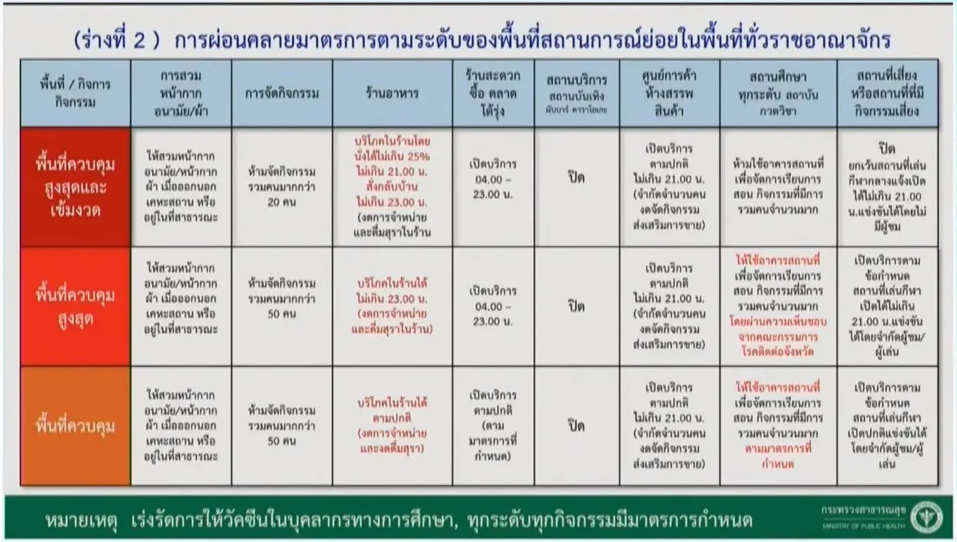 2.พื้นที่ควบคุมสูงสุด (สีแดง) นั่งทานอาหารในร้านได้ไม่เกิน 23.00 น. งดการจำหน่ายและดื่มสุราในร้าน และในสถานศึกษาอนุญาตให้ใช้อาคารสถานที่แต่ต้องผ่านความเห็นชอบจากคณะกรรมการโรคติดต่อจังหวัด