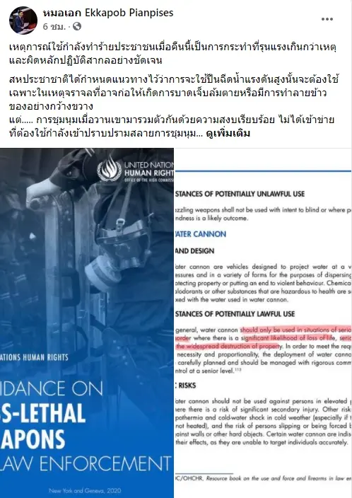 หมอเอก นายแพทย์เอกภพ เพียรพิเศษ ส.ส.เชียงราย เขต 1 พรรคก้าวไกล โพสต์เฟซบุ๊ก ระบุว่า “เหตุการณ์ใช้กำลังทำร้ายประชาชนเมื่อคืนนี้เป็นการกระทำที่รุนแรงเกินกว่าเหตุและผิดหลักปฏิบัติสากลอย่างชัดเจน