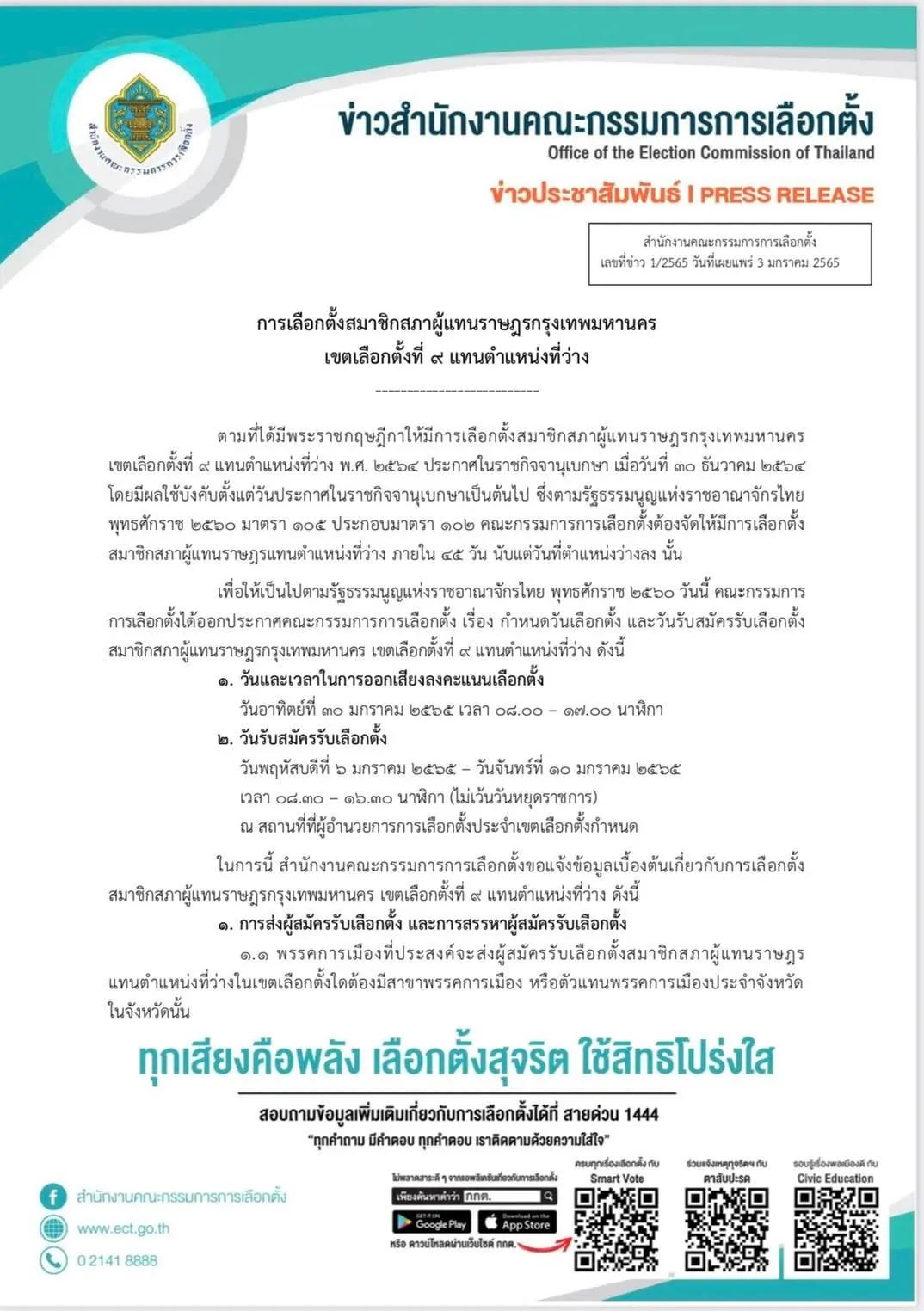 สำนักงานคณะกรรมการการเลือกตั้ง (กกต.) เผยแพร่ประกาศ เรื่อง กำหนดวันเลือกตั้ง และวันรับสมัครรับเลือกตั้งสมาชิกสภาผู้แทนราษฎรกรุงเทพมหานคร เขตเลือกตั้งที่ 9 แทนตำแหน่งที่ว่าง