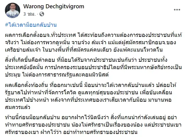 ผลการเลือกตั้งนายกอบจ นพ.วรงค์ เดชกิจวิกรม แกนนำกลุ่มไทยภักดี โพสต์ข้อความผ่านเฟซบุ๊ก ระบุว่า #ได้เวลาม็อบกลับบ้าน ผลการเลือกตั้งอบจ.ทั่วประเทศ ได้สะท้อนถึงความต้องการของประชาชนที่แท้จริงว่า ไม่ต้องการพวกดูหมิ่น จาบจ้วง ล้มเจ้า แม้แต่ผู้สมัครสมาชิกอบจ.ของเครือข่ายล้มเจ้า ในบางพื้นที่ที่สมัครแค่คนเดียว ยังแพ้คะแนนโหวตโน