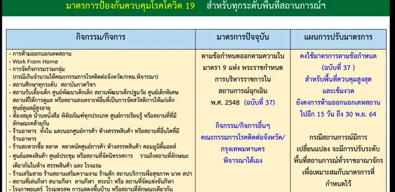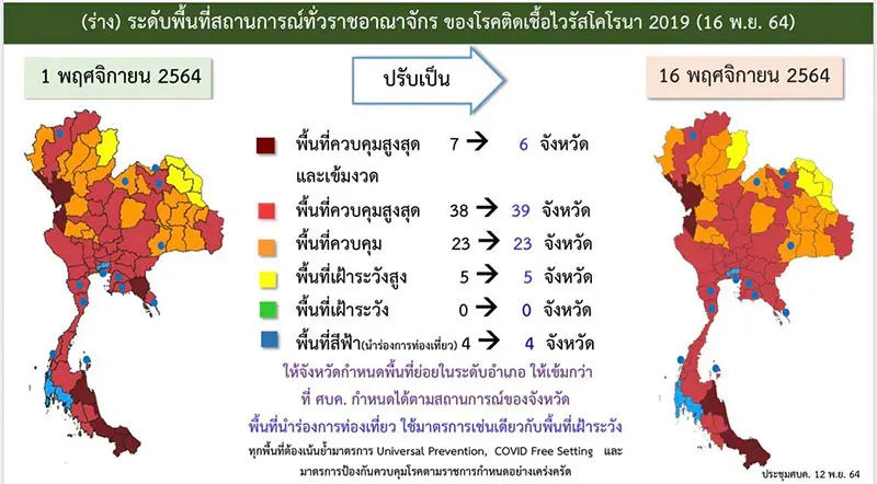 สถานบันเทิง — เมื่อวันที่ 12 พฤศจิกายน 2564 ในการประชุมคณะกรรมการบริหารสถานการณ์โควิด-19 (ศบค.) ครั้งที่ 18/2564 ที่มีพล.อ.ประยุทธ์ จันทร์โอชา นายกรัฐมนตรีและ รมว.กลาโหม ในฐานะผู้อำนวยการ ศบค.เป็นประธานได้มีมติเห็นชอบมาตรการปรับระดับพื้นที่สีตามสถานการณ์แพร่ระบาดโควิด19 ทั่วราชอาณาจักร ดังนี้