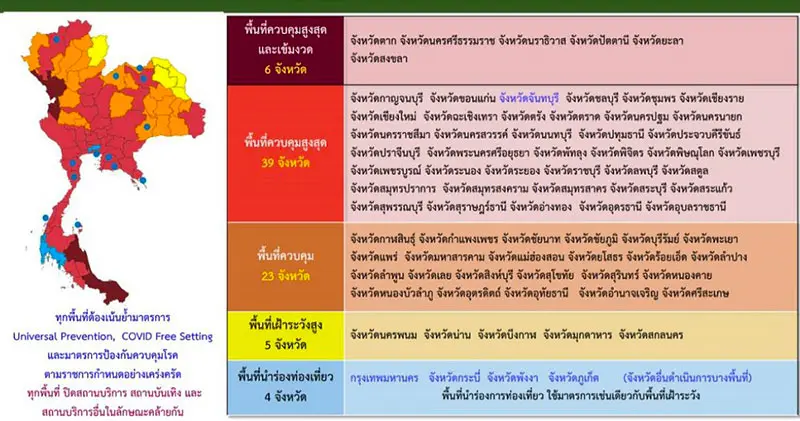 พื้นที่ควบคุมสูงสุด (สีแดง) จำนวน 39 จังหวัด ได้แก่ กาญจนบุรี ขอนแก่น จันทบุรี ชลบุรี ชุมพร เชียงราย เชียงใหม่ ฉะเชิงเทรา ตรัง ตราด นครปฐม นครนายก นครราชสีมา นครสวรรค์ นนทบุรี ปทุมธานี ประจวบคีรีขันธ์ ปราจีนบุรี พระนครศรีอยุธยา พิจิตร พิษณุโลก เพชรบุรี เพชรบูรณ์ ระนอง ราชบุรี ลพบุรี สตูล สมุทรปราการ สมุทรสงคราม สมุทรสาคร สระบุรี สระแก้ว สุพรรณบุรี สุราษฎร์ธานี อ่างทอง อุดรธานี อุบุลราชธานี