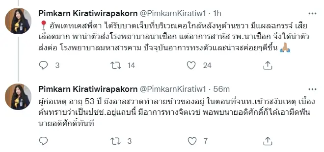 ต่อมา พิมพ์กาญจน์ กีรติวิราปกรณ์ ว่าที่ผู้สมัครส.ส.พรรคก้าวไกล(เขตคลองสามวา) ก็ได้ทวีตข้อความระบุว่า “ขอให้พี่ตา (สจ.อดิศักดิ์ สมบัติคำ) นักสู้เพื่อปชต @ มหาสารคามปลอดภัย พี่ตาอยู่ในห้อง ICU เนื่องจากมีคนร้ายบุกใช้มีดฟันคอ อาการสาหัส เขาฝันถึงรัฐสวัสดิการถ้วนหน้าการศึกษาที่ก้าวไกล สาธารณสุขที่ได้มาตรฐาน และอยากเห็นอำนาจสูงสุดเป็นของปชช. สู้นะพี่…พี่ต้องได้เห็นวันนั้นด้วยกัน”