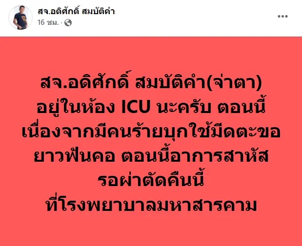 “สจ.อดิศักดิ์ สมบัติคำ(จ่าตา) อยู่ในห้อง ICU นะครับ ตอนนี้เนื่องจากมีคนร้ายบุกใช้มีดตะขอยาวฟันคอ ตอนนี้อาการสาหัส รอผ่าตัดคืนนี้ ที่โรงพยาบาลมหาสารคาม”