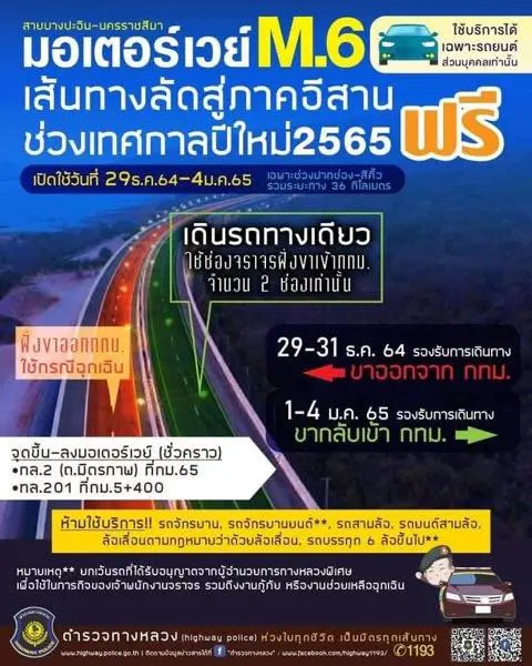 ทั้งนี้ เพื่ออำนวยความสะดวกให้ประชาชนเดินทางฟรี ช่วงเทศกาลปีใหม่ 2565 และแบ่งเบาการจราจรบนถนนมิตรภาพ เริ่มเปิดให้ใช้วันที่ 29 ธันวาคม 2564 – 4 มกราคม 2565