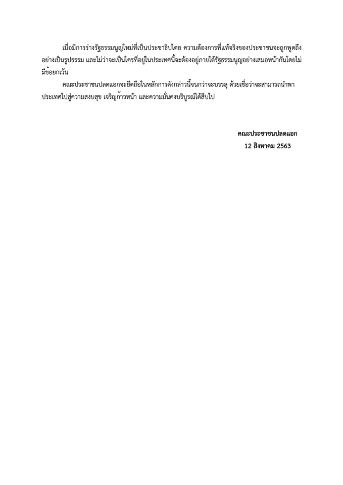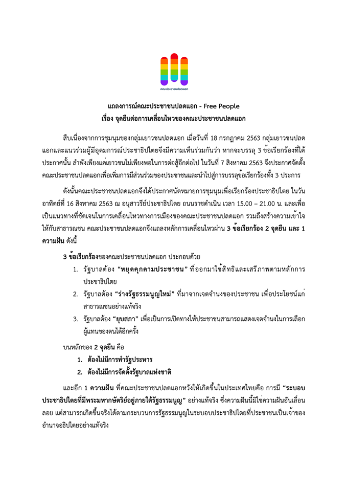 คณะประชาชนปลดแอก Free People ออกแถลงการณ์แสดงจุดยืนในการเคลื่อนไหวทางการเมืองโดยการย้ำ 3 ข้อเรียกร้อง 2 จุดยืมเดิมของคณะประชาชนปลดแอก พร้อมทั้งประกาศนัดหมายการชุมนุมเพื่อเรียกร้องประชาธิปไตย ในวันอาทิตย์ที่ 16 สิงหาคมนี้ โดยแถลงการณ์มีรายละเอียดดังนี้