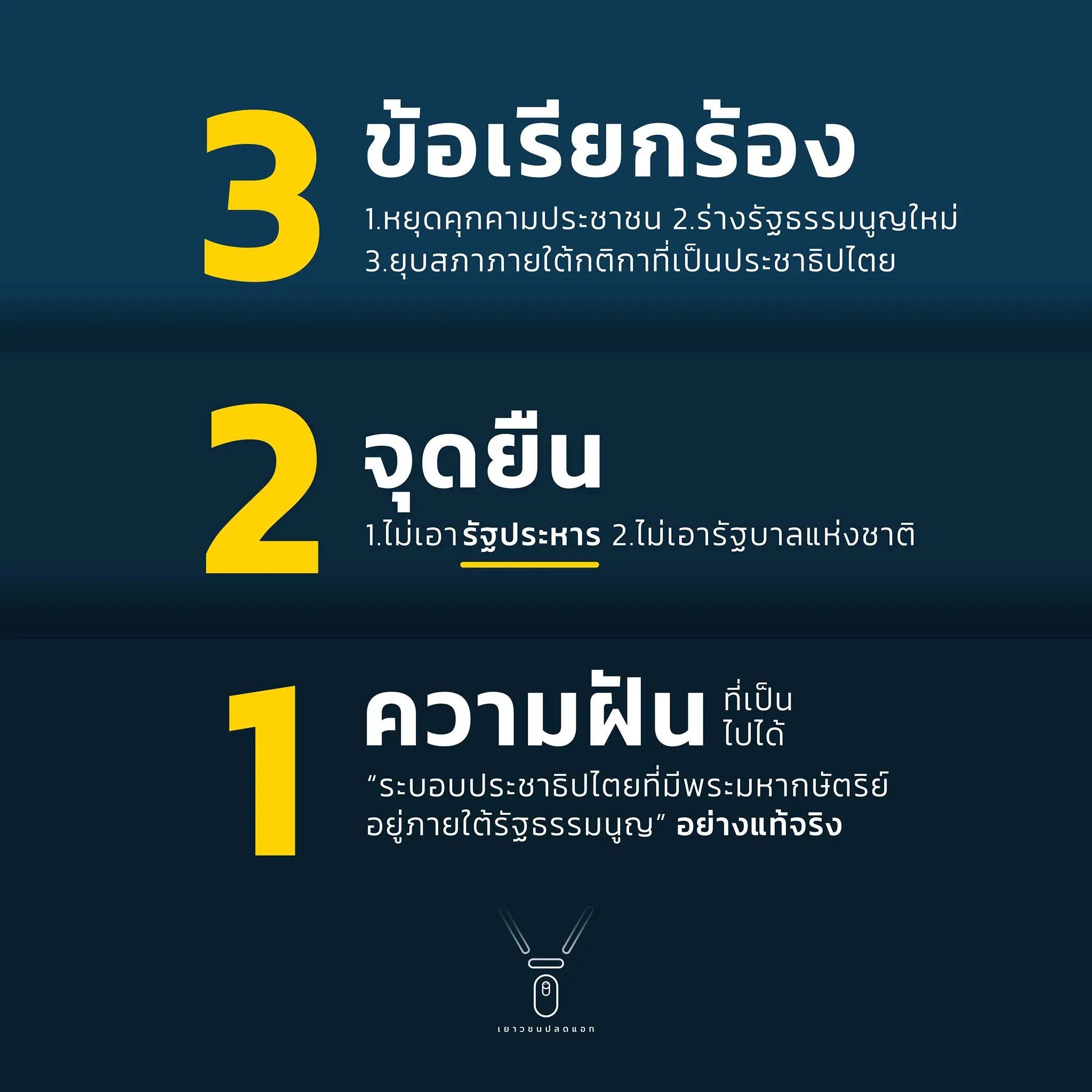 3 ข้อเรียกร้อง 2 จุดยืน และ 1 ความฝันที่เป็นไปได้นี้ จะเป็นกุญแจที่ปลดล็อคปัญหาของประเทศไทยที่ดำรงมาอย่างยาวนานหลายทศวรรต ให้ทุกคนได้อยู่ร่วมกันอย่างสันติ มาร่วมสร้างสังคมที่ดีกว่าให้กับเยาวชนและประชาชนในประเทศนี้ไปด้วยกัน ไม่มีอีกแล้วความเหลื่อมล้ำต่ำสูง