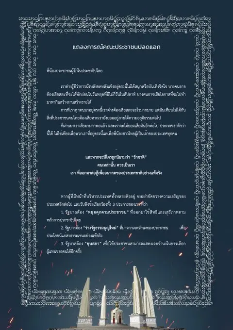 ทวิตเตอร์ FREEPEOPLE ได้เปิดเผยแถลงการณ์ปิดการชุมนุมของกลุ่ม ประชาชนปลดแอก โดยมีข้อความว่า ภาพบรรยากาศการร่วมชุมนุมช่วงค่ำ ณ บริเวณอนุสาวรีย์ประชาธิปไตย โดยมีประชาชนจำนวนมากที่มาร่วมกันส่งเสียงอันทรงพลังของผู้เป็นเจ้าของอธิปไตย