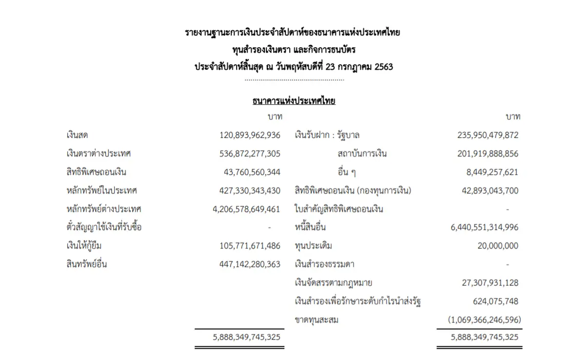 กระทรวงการคลังได้ประกาศรายงานฐานะการเงินประจําสัปดาห์ของธนาคารแห่งประเทศไทย ทุนสํารองเงินตรา และกิจการธนบัตร งวดประจําสัปดาห์สิ้นสุด ณ วันพฤหัสบดีที่ ๒๓ กรกฎาคม พ.ศ. ๒๕๖๓