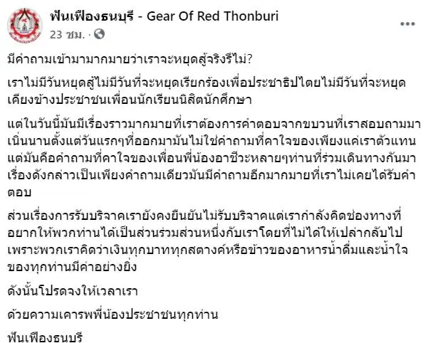 ล่าสุดกลุ่ม ฟันเฟืองธนบุรี ได้ออกมาชี้แจงแล้วว่าจะยังคงอยู่เคียงข้างประชาชนเพื่อนนักเรียนนิสิตนักศึกษา เพียงแต่ต้องการคำตอบจากขบวนการที่ตนร่วมถึงแนวทางในการต่อสู้