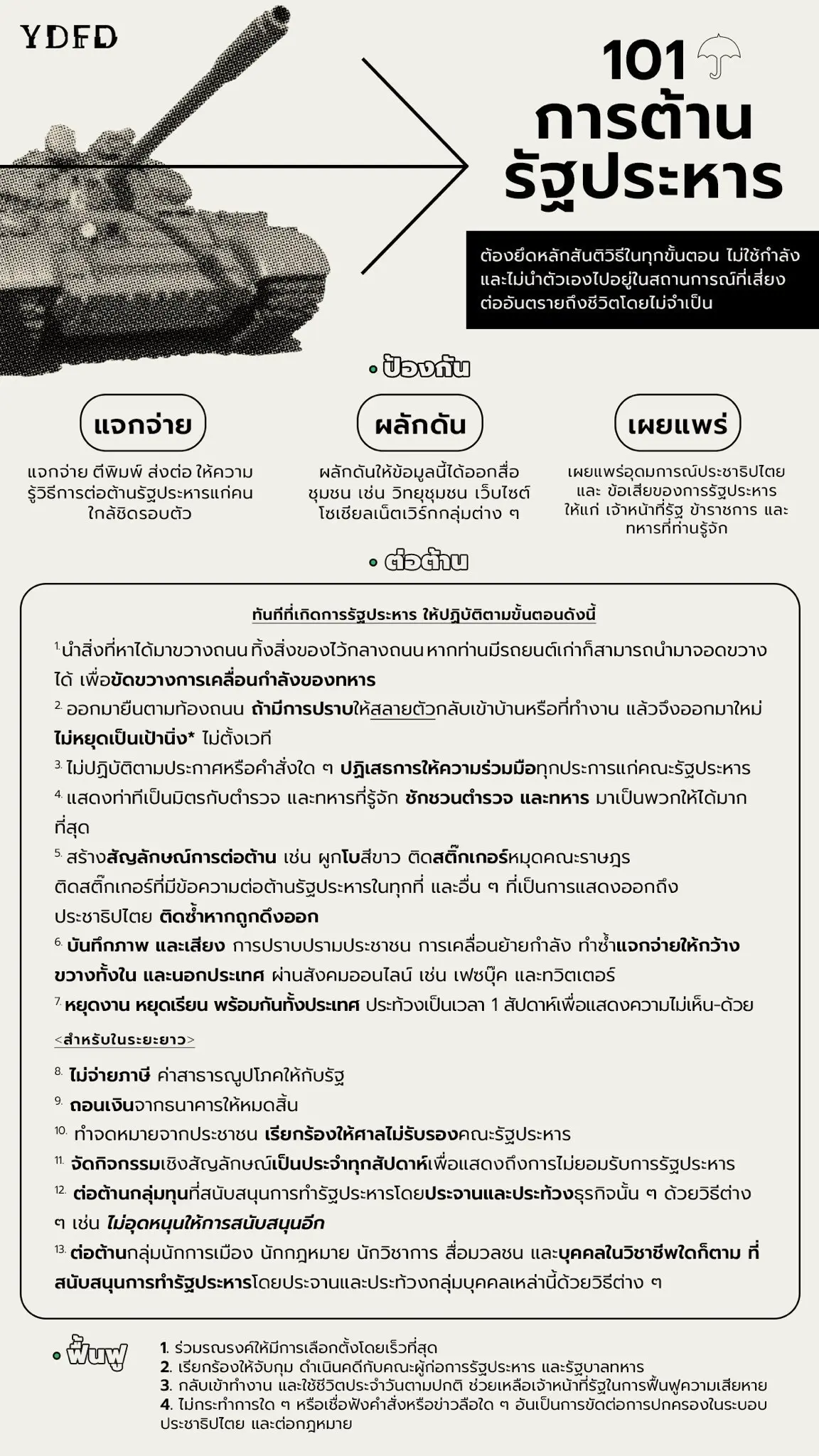 ขณะเดียวกันบรรดาผู้ใช้งานทวิตเตอร์ยังได้ช่วยกันแชร์“คู่มือต่อต้านรัฐประหารอย่างเป็นระบบ” และ “บัญญัติ 10 ประการ คัดค้านรัฐประหาร” ซึ่งบอกวิธีต่อต้านรัฐประหารอย่างเป็นระบบและสันติวิธีด้วย