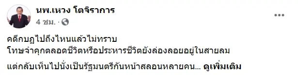 นาย เหวง โตจิราการ แกนนำแนวร่วมประชาธิปไตยต่อต้านเผด็จการแห่งชาติ (นปช.) โพสต์เฟซบุ๊ก ระบุว่า คดีกบฏไปถึงไหนแล้วไม่ทราบ โทษจำคุกตลอดชีวิตหรือประหารชีวิตยังล่องลอยอยู่ในสายลม แต่กลับเห็นไปนั่งเป็นรัฐมนตรีกันหน้าสลอนหลายคน
