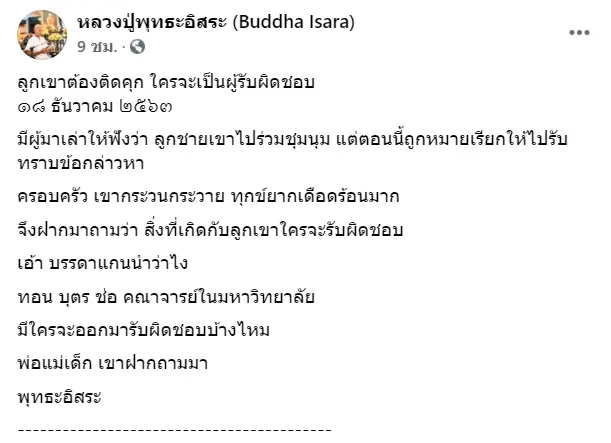 พุทธะอิสระ อดีตเจ้าอาวาสวัดอ้อน้อย และอดีตแกนนำ กปปส. โพสต์ข้อความผ่านเฟซบุ๊ก ระบุว่า ลูกเขาต้องติดคุก ใครจะเป็นผู้รับผิดชอบ