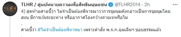 สุดท้ายศาลชี้ว่า ไม่จำเป็นต้องพิจารณาว่าการชุมนุมดังกล่าวเป็นการชุมนุมโดยสงบ มีการเว้นระยะห่าง หรืออากาศโล่งกว้างถ่ายเทหรือไม่ โดยศาลชี้ว่า ไม่จำเป็นต้องพิจารณา เพราะคำสั่ง พ.ร.ก.ฉุนเฉินฯ ชอบธรรมแล้ว