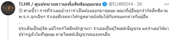 ศาลชี้ว่า การที่จำเลยอ้างว่าจำเป็นต้องออกมาชุมนุม ขณะที่ผู้อื่นถูกจำกัดสิทธิตาม พ.ร.ก.ฉุกเฉินฯ จำเลยมีเจตนาให้กฎหมายบังคับใช้กับตนแตกต่างกับผู้อื่น ประเด็นเป็นผู้จัด แม้โจทก์ไม่มีหลักฐานว่า จำเลยเป็นผู้โพสต์เชิญชวน แต่จำเลยได้มาปรากฎตัวในที่ชุมนุม ตามโพสต์เชิญชวนของเพจอื่น