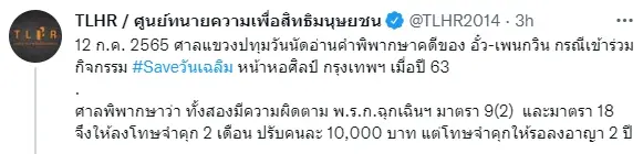 ความเคลื่อนไหวกรณีศาลแขวงปทุมวันนัดอ่านคำพิพากษาคดีของ เพนกวิน พริษฐ์ และ อั๋ว จุฑาทิพย์ กรณีเข้าร่วมกิจกรรม Save วันเฉลิม หน้าหอศิลป์ กรุงเทพฯ เมื่อปี 63 โดยกิจกรรมดังกล่าวมีจุดประสงค์เพื่อทวงความเป็นธรรมให้กับ วันเฉลิม สัตย์ศักดิ์สิทธิ์ นักเคลื่อนไหวที่ถูกบังคับสูญหายไป
