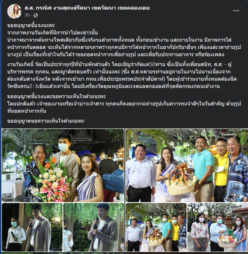 นำภาพมาจากต้นทางโพสเดียวกันซึ่งจริงๆแล้วภาพทั้งหมด ทั้งก่อนเข้างาน และภายในงาน มีภาพการใส่หน้ากากกันตลอด จะเห็นได้จากหลายๆภาพว่าทุกคนมีการใส่หน้ากากในอากัปกริยาอื่นๆ เพียงแต่เวลาถ่ายรูปบางรูป เป็นเรื่องที่เข้าใจกันได้ว่าขอถอดหน้ากากเพื่อถ่ายรูป และเพื่อรับประทานอาหาร หรือร้องเพลง