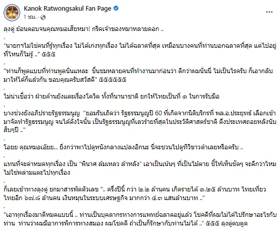 เกี่ยวกับกรณีดังกล่าว กนก รัตน์วงศ์สกุล พิธีกรข่าวชื่อดัง โพสต์ข้อความผ่านเพจเฟซบุ๊ก Kanok Ratwongsakul Fan Page ระบุข้อความว่า