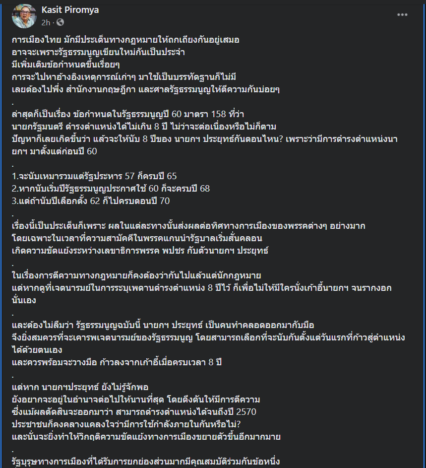 นาย กษิต ภิรมณ์ อดีตรัฐมนตรีว่าการกระทรวงการต่างประเทศ ในสมัยรัฐบาลนายอภิสิทธิ์ เวชชาชีวะ ได้โพสต์ข้อความผ่านทางเฟซบุ๊กส่วนตัว แสดงความคิดเห็นในประเด็นการตีความการอยู่ในตำแหน่งนายกรัฐมนตรีของพล.อ.ประยุทธ์ จันทร์โอชาว่าเกิน 8 ปีหรือไม่ โดยนายกษิตได้แสดงความคิดเห็นในเรื่องดังกล่าวว่า