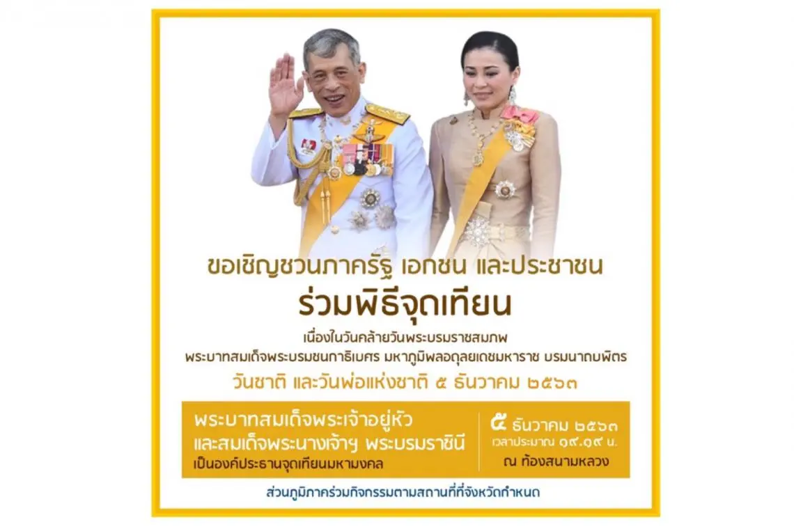 พล.อ.ประยุทธ์ จันทร์โอชา นายกรัฐมนตรีและรมว.กลาโหม เปิดเผยว่า รัฐบาลขอเชิญชวนปวงชนชาวไทยทุกหมู่เหล่าเฝ้าฯรับเสด็จพระบาทสมเด็จพระเจ้าอยู่หัวและสมเด็จพระนางเจ้าฯพระบรมราชินี ในโอกาสเสด็จพระราชดำเนินทรงเป็นประธานในพิธีจุดเทียนมหามงคล เพื่อสดุดีพระเกียรติคุณ และน้อมรำลึกในพระมหากรุณาธิคุณของพระบาทสมเด็จพระบรมชนกาธิเบศร มหาภูมิพล อดุลยเดชมหาราช บรมนาถบพิตร เนื่องในโอกาสวันคล้ายวันพระบรมราชสมภพ วันพ่อแห่งชาติและวันชาติ 5 ธันวาคม 2563ท่ามกลางมหาสมาคมของประชาชนทุกหมู่เหล่า ซึ่งเป็นครั้งแรกและครั้งสำคัญของประวัติศาสตร์ชาติไทยในวันเสาร์ที่ 5 ธ.ค.เวลา 19.19 น.ณ มณฑลพิธีท้องสนามหลวง