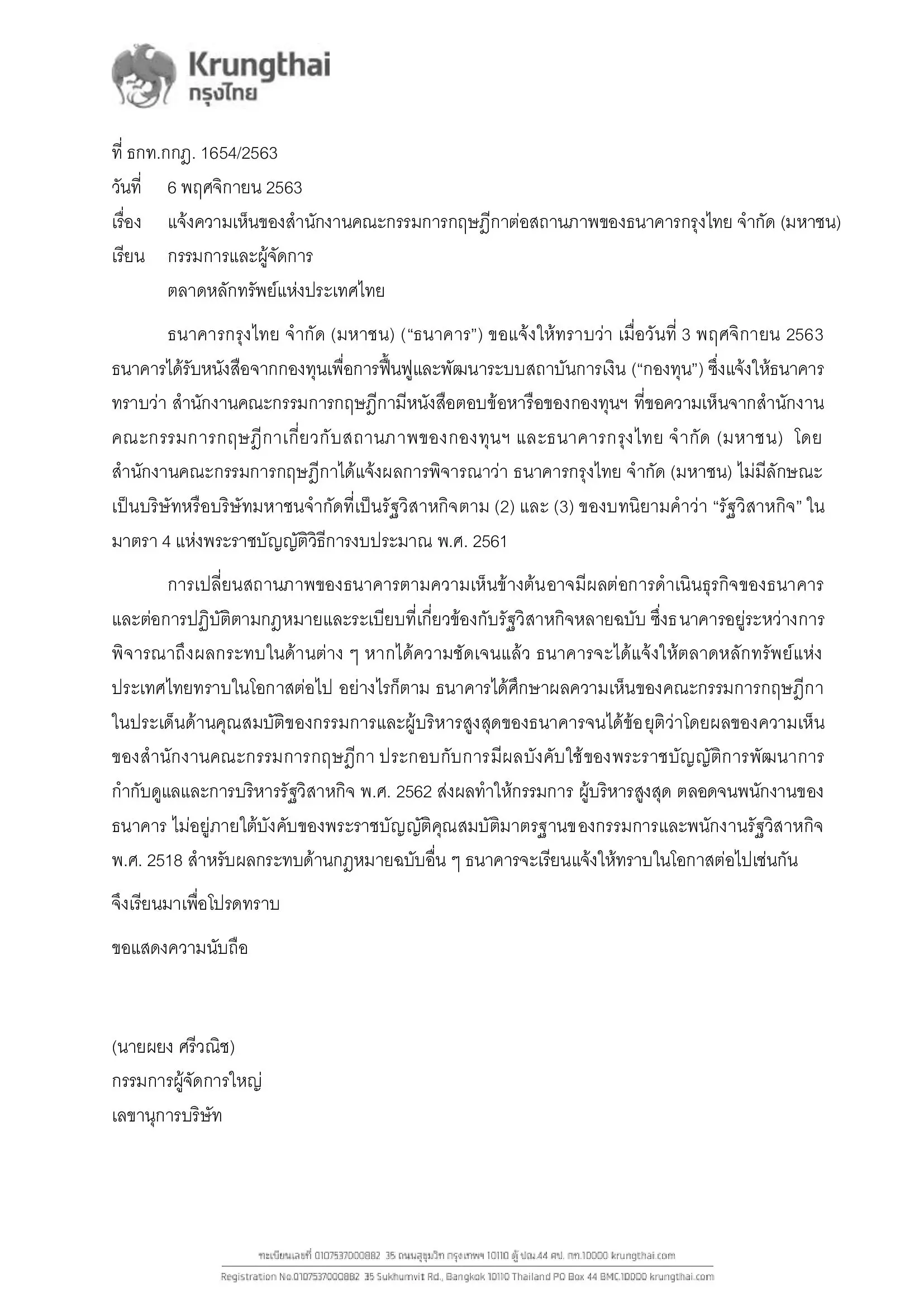 ธนาคาร กรุงไทย (KTB) แจ้งว่า เมื่อวันที่ 3 พฤศจิกายน 2563 ธนาคารได้รับหนังสือจากกองทุนเพื่อการฟื้นฟูและพัฒนาระบบสถาบันการเงิน (กองทุน) ซึ่งแจ้งให้ธนาคารทราบว่า สำนักงานคณะกรรมการกฤษฎีกามีหนังสือตอบข้อหารือของกองทุนฯ ที่ขอความเห็นจากสำนักงาน คณะกรรมการกฤษฎีกาเกี่ยวกับสถานภาพของกองทุนฯ และธนาคารกรุงไทย โดยสำนักงานคณะกรรมการกฤษฎีกาได้แจ้งผลการพิจารณาว่า ธนาคารกรุงไทย ไม่มีลักษณะเป็นบริษัทหรือบริษัทมหาชนจำกัดที่เป็นรัฐวิสาหกิจตาม (2) และ (3) ของบทนิยามคำว่า “รัฐวิสาหกิจ” ในมาตรา 4 แห่งพระราชบัญญัติวิธีการงบประมาณ พ.ศ. 2561