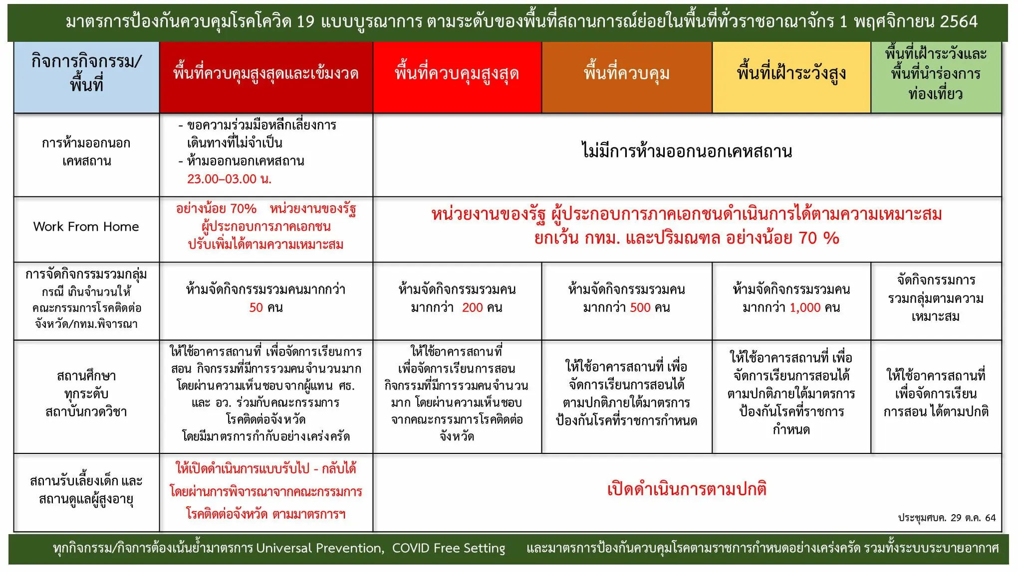 –ร้านอาหาร เปิดได้ตามปกติ นั่งทานในร้านได้ ไม่ห้ามการนั่งดื่มเครื่องดื่มแอลกอฮอล์ในร้าน เฉพาะกรุงเทพฯ จะมีมาตรการเฉพาะประกาศอีกครั้ง