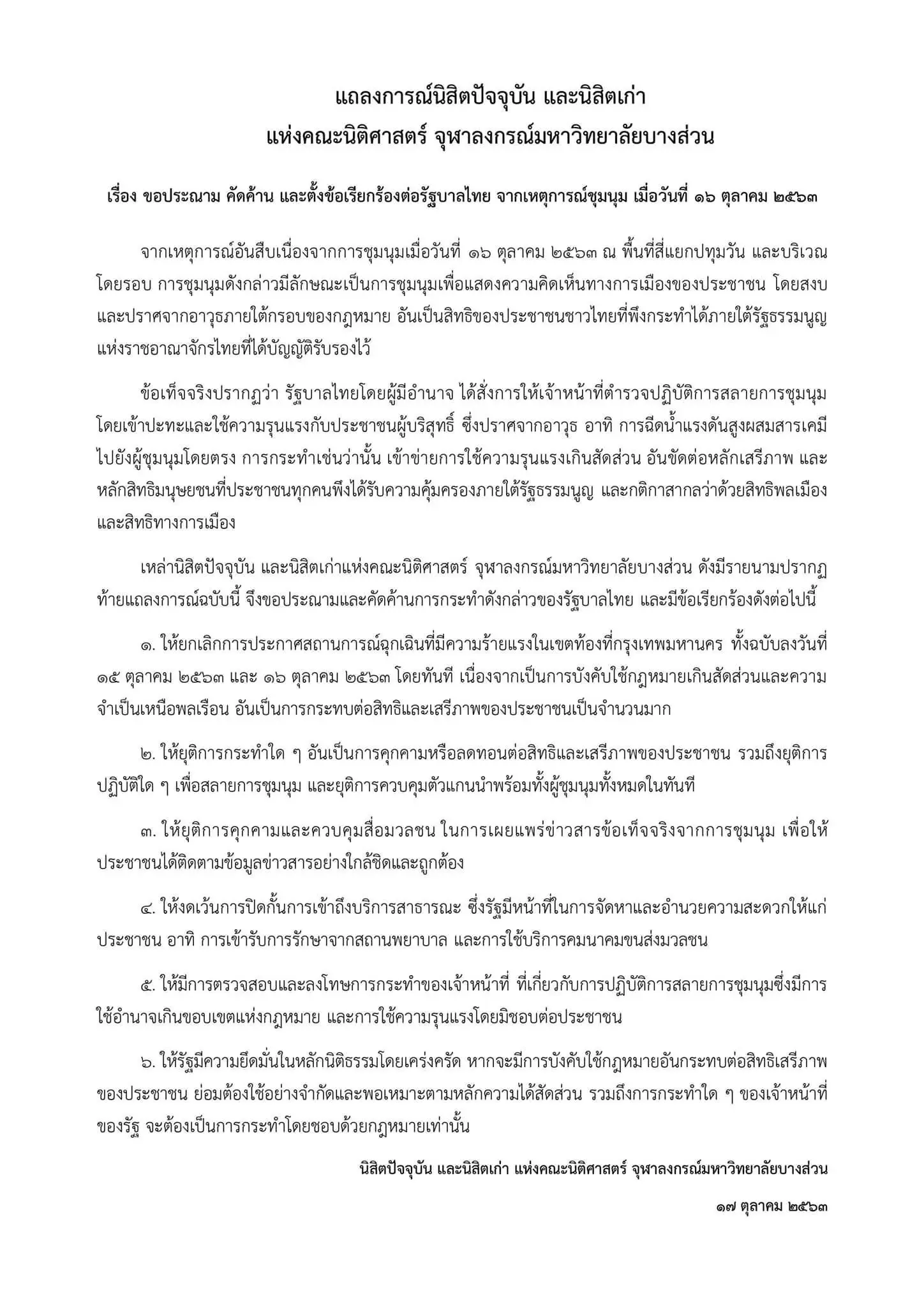 เหล่านิสิตปัจจุบัน และนิสิตเก่าแห่งคณะนิติศาสตร์ จุฬาลงกรณ์มหาวิทยาลัยบางส่วน ดังมีรายนามปรากฏท้ายแถลงการณ์ฉบับนี้ จึงขอประณามและคัดค้าน การกระทำดังกล่าวของรัฐบาลไทย และมีข้อเรียกร้องดังต่อไปนี้