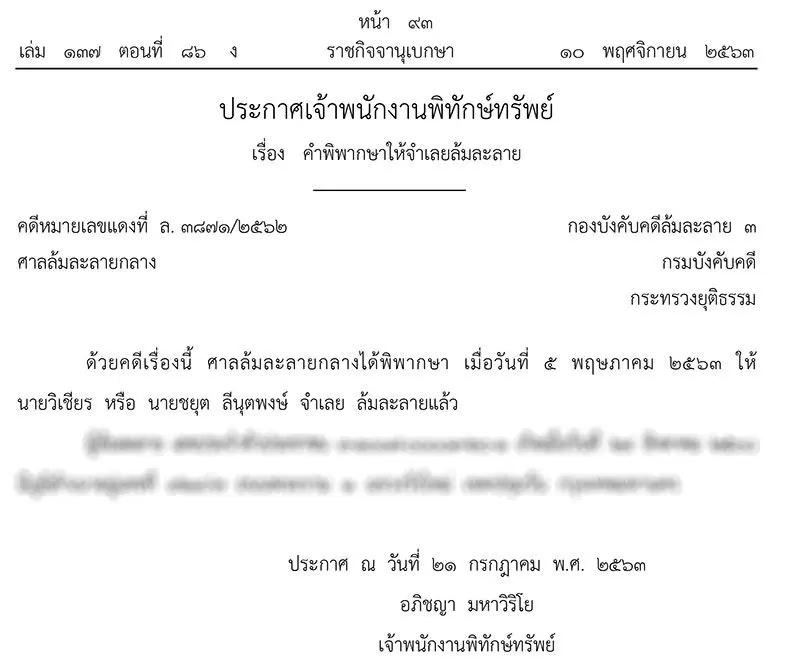 เมื่อวันที่ 10 พฤศจิกายน 2563 เว็บไซต์ ราชกิจจานุเบกษา ได้เผยแพร่ประกาศ เจ้าพนักงานพิทักษ์ทรัพย์ เรื่องคำพิพากษาให้จำเลยล้มละลาย ในคดีหมายเลขแดงที่ ล. 3871/2562 กองบังคับคดีล้มละลาย 3 ศาลล้มละลายกลาง กรมบังคับคดี กระทรวงยุติธรรม