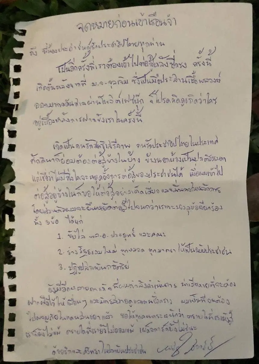 เกิดเป็นคนรักสิทธิเสรีภาพ คนรักประชาธิปไตยในประเทศศักดินาย่อมต้องต่อสู้ข้างในบ้าง ข้างนอกบ้าง เป็นปกติธรรมดา แต่เชื่อว่าไม่มีสิ่งใดจะหยุดยั้งการต่อสู้ของประชาชนได้ เมื่อผมเข้าไปต่อสู้อยู่ข้างใน ก็ขอให้ต่อสู้อย่างเด็ดเดี่ยวและมั่นคงในหลักการ โดยส่วนตัวผมจะยืนหยัดต่อสู้ไปจนกว่าเราจะบรรลุข้อเรียกร้องทั้ง 3 ข้อ ได้แก่