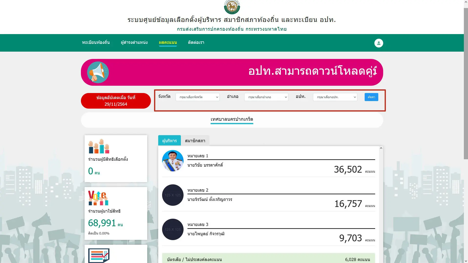 ผลเลือกตั้งนายกอบต. —- หลังการเลือกตั้งอบต. ซึ่งมีขึ้นเมื่อวันที่ 28 พ.ย. 2564 ที่ผ่านมา ในเวลานี้ กรมส่งเสริมการปกครองท้องถิ่น กระทรวงมหาดไทยได้จัดทำเว็บไซต์ให้ประชาชนสามารถเข้าไปตรวจสอบผลการนับคะแนนเลือกตั้งนายกอบต.และสมาชิกสภาอบต. ทั่วประเทศอย่างไม่เป็นทางการ ผ่านทางเว็บไซต์ https://ele.dla.go.th/public/score.do