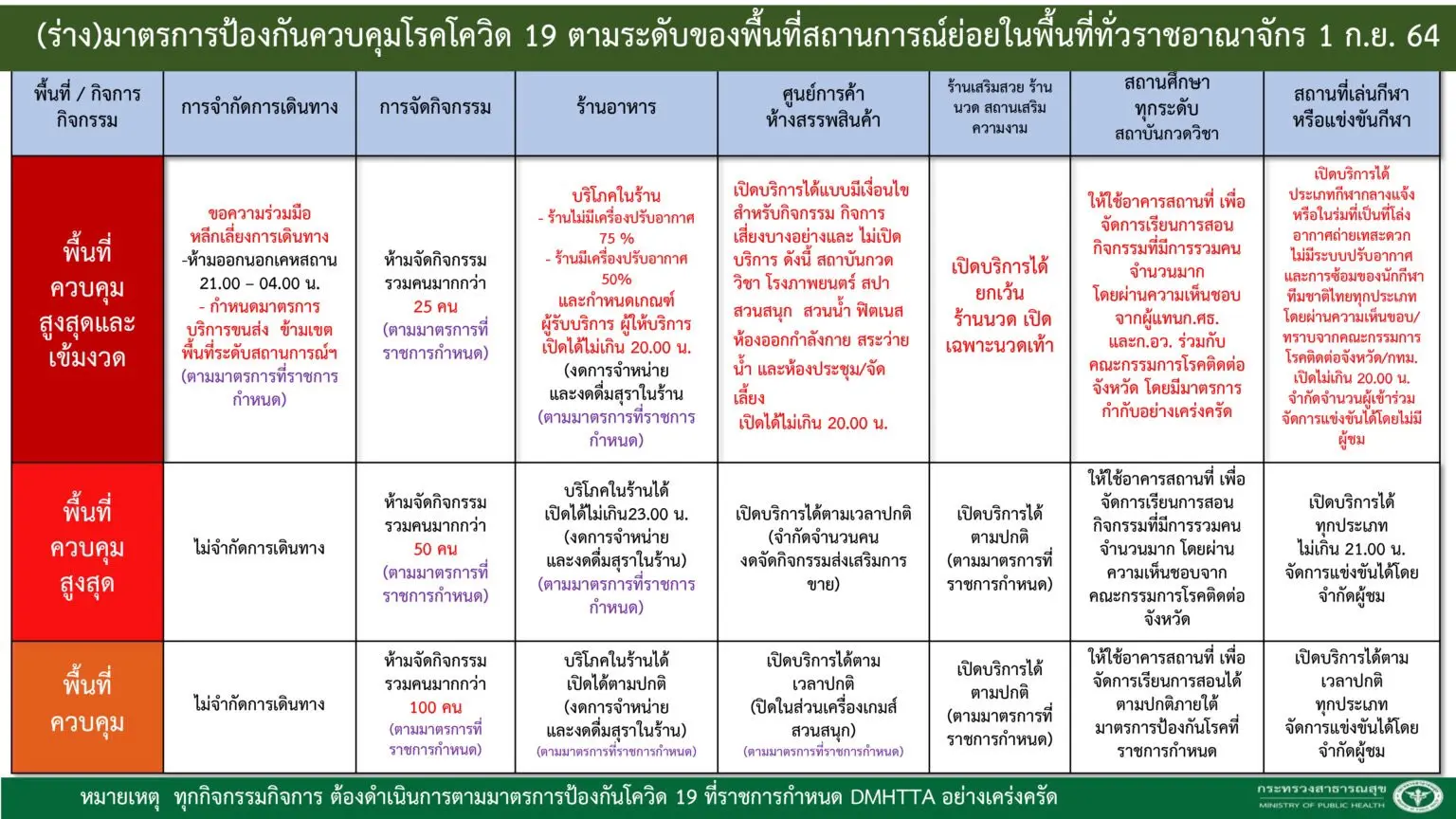 -ร้านเสริมสวย หรือตัดผม, ร้านนวด เปิดได้ตามปกติ แต่นวดได้เฉพาะฝ่าเท้า คลินิกเสริมความงาม เปิดจำหน่ายสินค้าเท่านั้น (อาจมีการนัดหมายล่วงหน้า เมื่อมีความพร้อม) ร้านอาหาร เปิดได้ตามเงื่อนไขของมาตรการร้านอาหารมีเครื่องปรับอากาศ